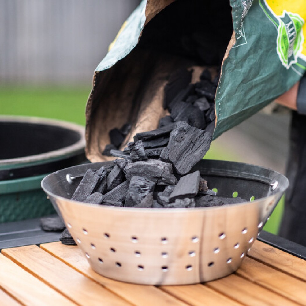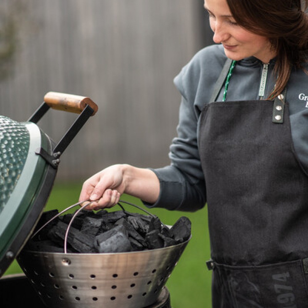 Кошик для вугілля Big Green Egg призначений для легкого і швидкого розпалювання, а також вилучення вугілля з гриля. Просто підніміть кошик за зручні ручки і витрусити золу у відро для сміття. Кошик вставляється в гриль замість чавунного колосника.