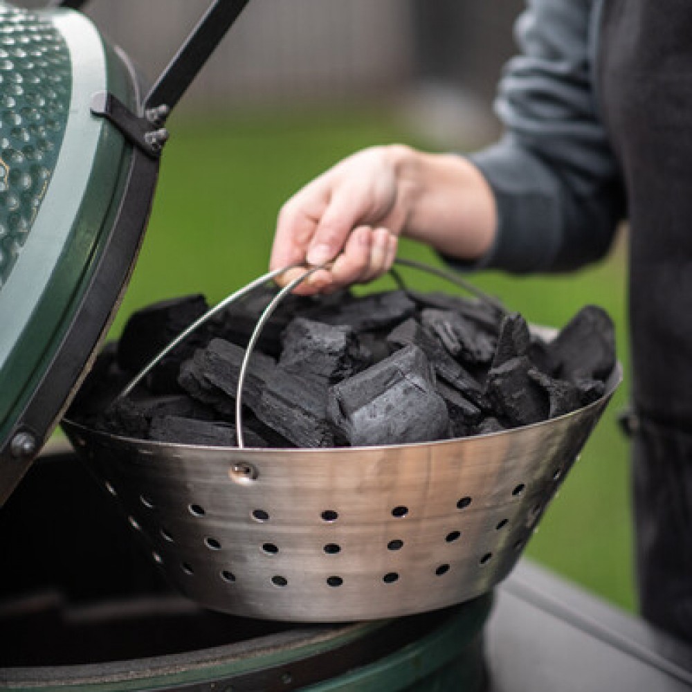 Кошик для вугілля Big Green Egg призначений для легкого і швидкого розпалювання, а також вилучення вугілля з гриля. Просто підніміть кошик за зручні ручки і витрусити золу у відро для сміття. Кошик вставляється в гриль замість чавунного колосника.