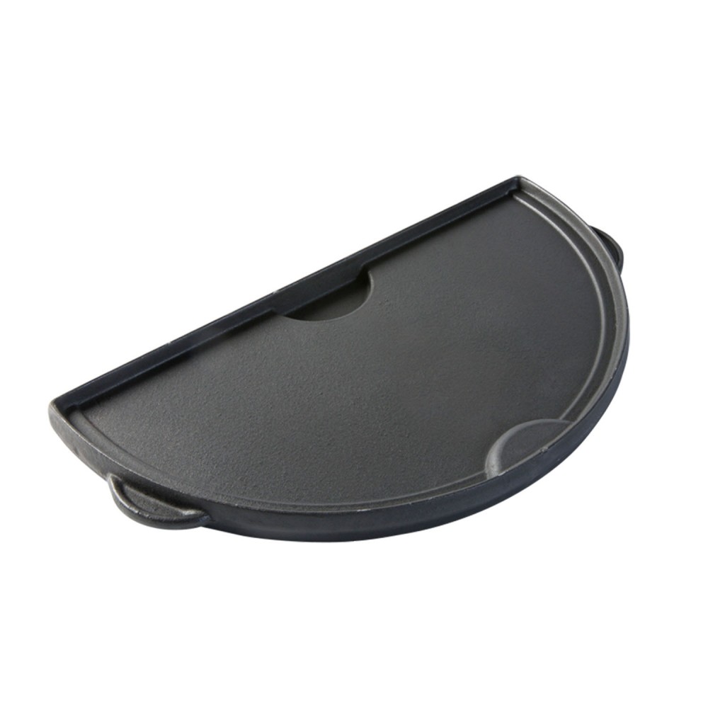 Двостороння напівокругла решітка з натурального литого чавуну. Пласка сторона чудово підходить для приготування оладів, яєшні, омлетів. Ребриста - для біфштексів, відбивних або котлет.