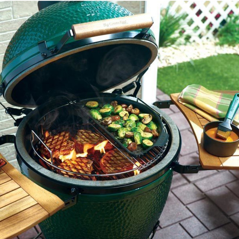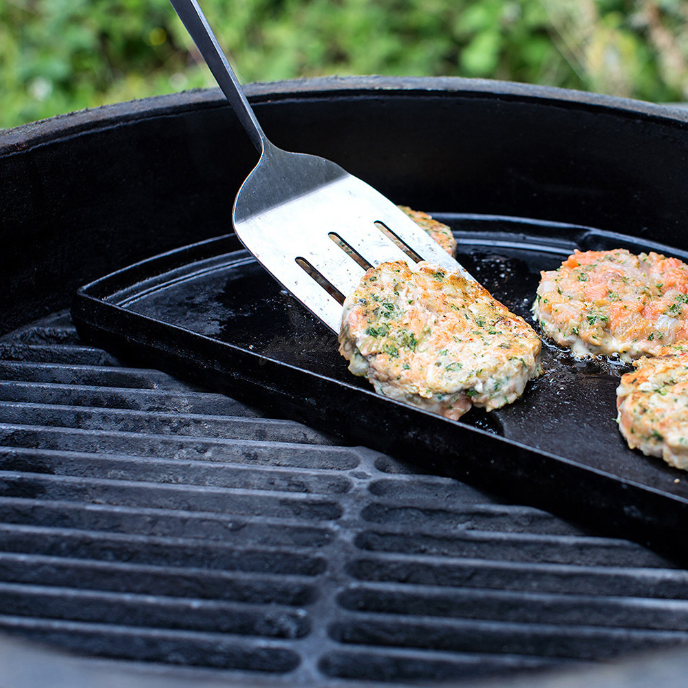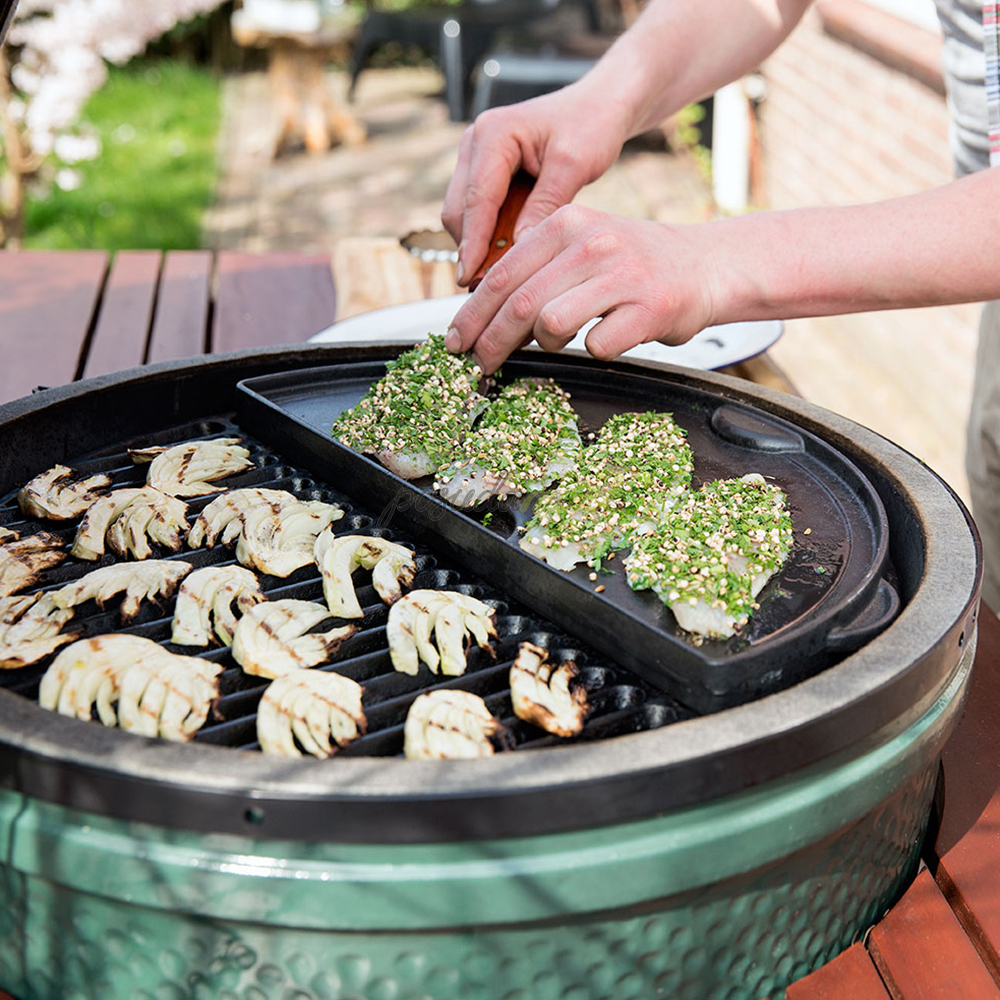 Чавунна двостороння сковорода: рельєфна сторона для ніжних або дрібних інгредієнтів, а гладка сторона ідеально підходить для млинців, оладок або яєчні. І ще залишається половина робочої поверхні. Хіба потрібно щось ще?